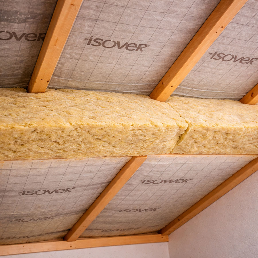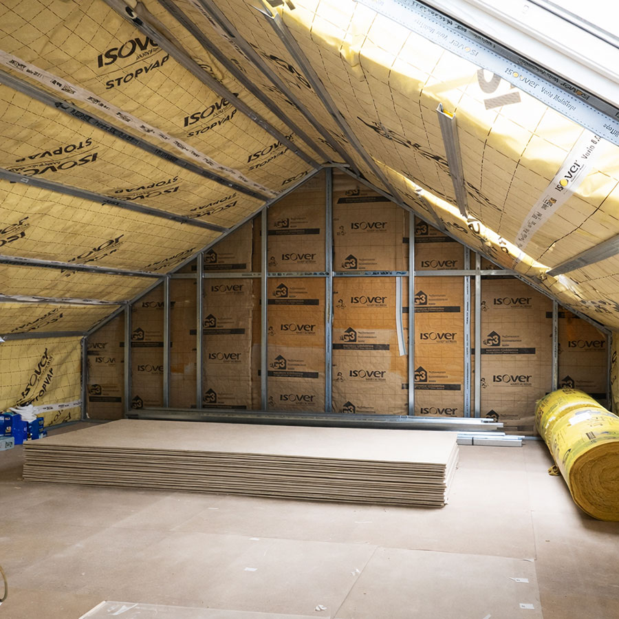 Première couche entre chevrons, seconde couche croisée sur suspentes. Découpe soignée autour des fenêtres de toit, des poutres et des sorties de ventilation.