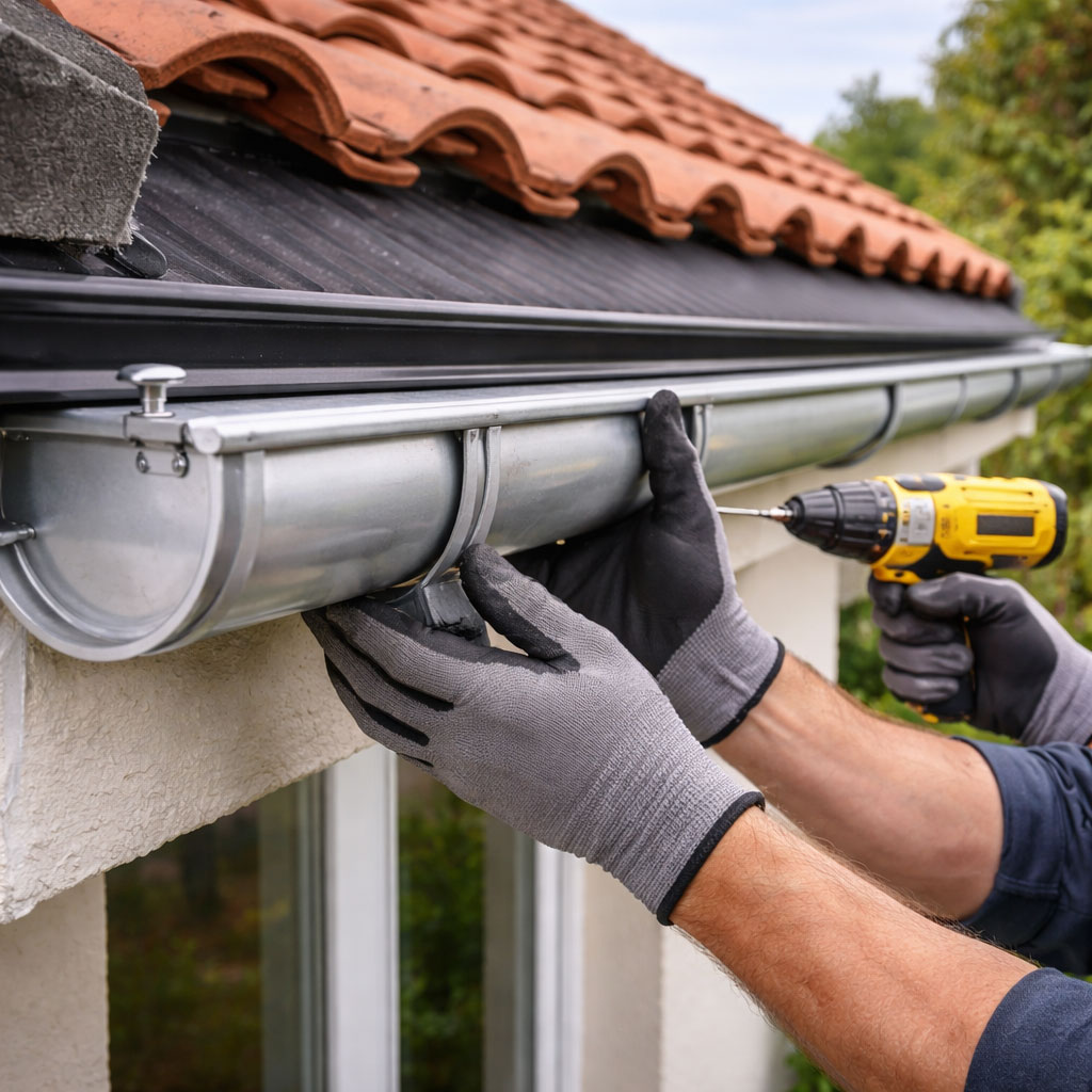 Installation complète de système d’évacuation des eaux pluviales : prise de mesures et calcul de dimensionnement selon surface de toiture, pose de gouttières pendantes (demi-rondes, carrées, moulurées), installation de crochets et supports adaptés à votre type de toiture, raccordement aux descentes d’eau pluviale, mise en place de crapaudines et grilles anti-feuilles.