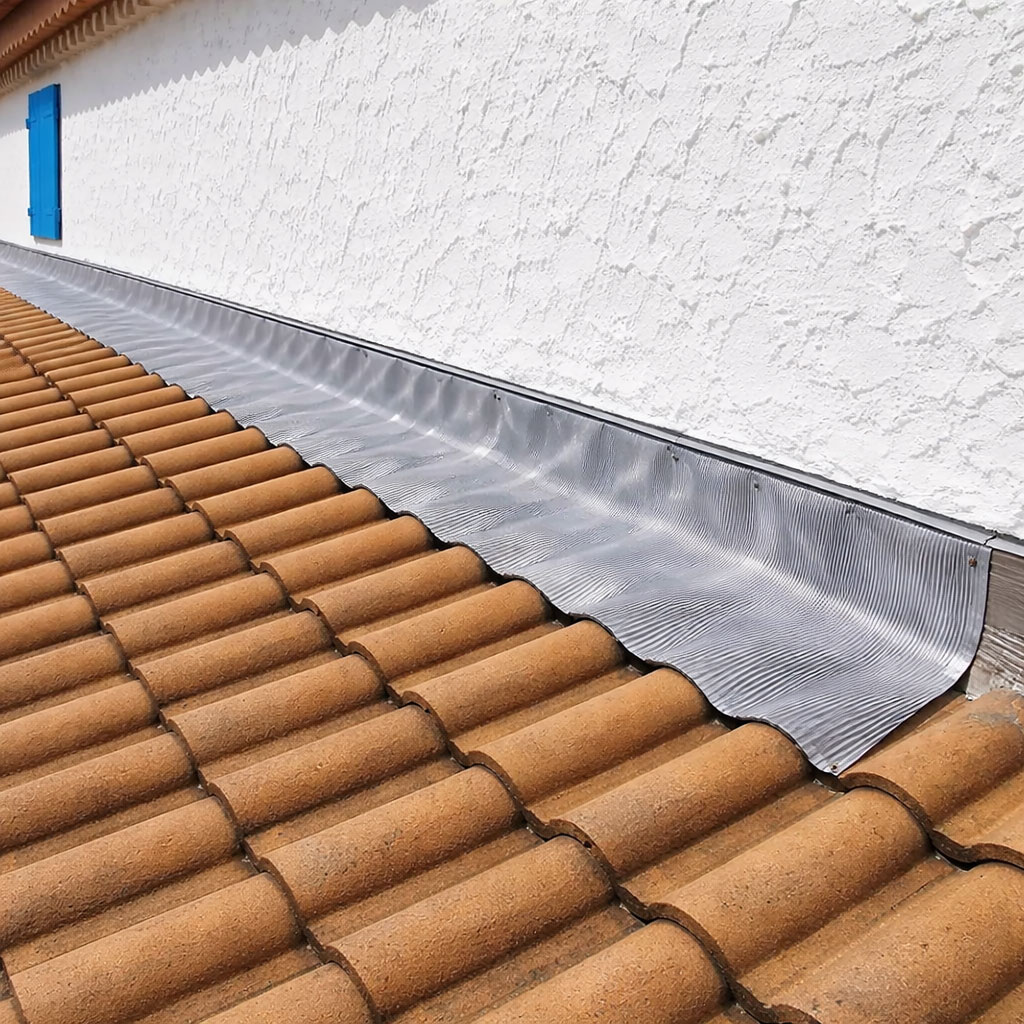 Solins de mur : raccord étanche entre toiture et mur de façade ou pignon, profilé métallique serti dans le mur, recouvrement sur tuiles minimum 15cm.